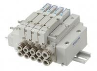 プラグコネクタ部とソレノイド部に防水パッキンを採用し保護構造IP65対応を可能に。幅広い使用環境に適用できます。組み立てや増連・減連が簡単なイージービルド形マニホールドにてお見せいたします。