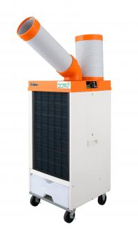 ドレン処理が不要で排熱の無いスポットエアコン。同じ1㏋のスポットエアコンと比較して13倍と25倍の2機種あり。気化熱を利用して涼風をつくり、それを1㏋の冷凍機の力で多量の冷風にする優れモノ。